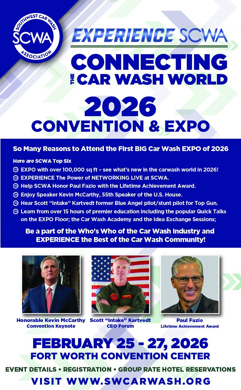 IT’S A NEW YEAR! Keep up – Come see what’s new in the car wash industry at SCWA Convention & EXPO – First BIG Car Wash EXPO of the Year. In addition to visiting the First BIG Car Wash Show of the Year with over 450 exhibitor booths displaying the very latest in technology, equipment, supplies and services – MORE BIG REASONS TO REGISTER TODAY! • EXPERIENCE The Power of NETWORKING LIVE at SCWA. • Help SCWA Honor Paul Fazio - Lifetime Achievement Award. • Enjoy Speaker Kevin McCarthy, 55th Speaker of the U.S. House. • Experience the motivation of Blue Angel Pilot Scott "Intake" Kartvedt. • Over 15 hours of premier education sessions. Be a part of the Who's Who of the Car Wash Industry and EXPERIENCE the Best of the Car Wash Community! REGISTER TODAY - https://swcarwash.org/events/2026-convention-expo